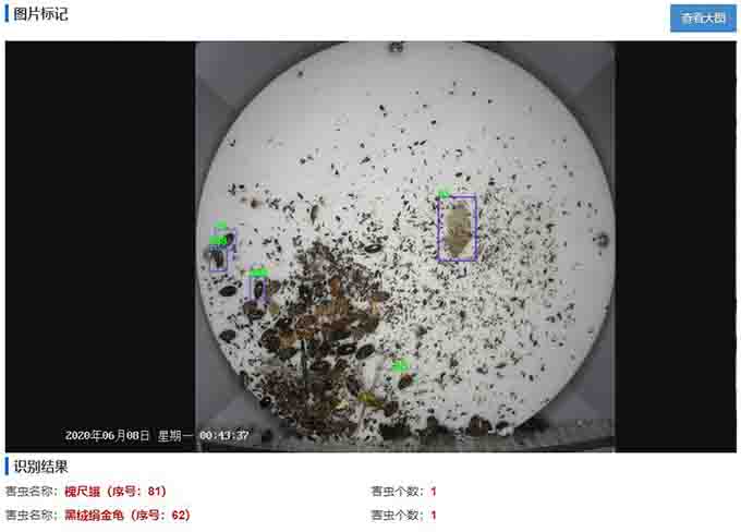 病蟲害監(jiān)測(cè)預(yù)警系統(tǒng)通過(guò)云端的人工智能引擎可對(duì)害蟲蟲體進(jìn)行自動(dòng)標(biāo)記和識(shí)別,對(duì)害蟲進(jìn)行分類計(jì)數(shù)。通過(guò)利用人工智能技術(shù),系統(tǒng)可識(shí)別柳藍(lán)葉甲、褸裳夜蛾、灰胸突鰓金龜、金星尺蛾、美苔蛾等害蟲,識(shí)別種類多達(dá)100多種,識(shí)別準(zhǔn)確率高于85%,大幅提升識(shí)別率。通過(guò)遠(yuǎn)程監(jiān)測(cè),用戶可以在線準(zhǔn)確掌握林業(yè)病蟲害發(fā)生情況,針對(duì)具體蟲害類型采取防治措施。